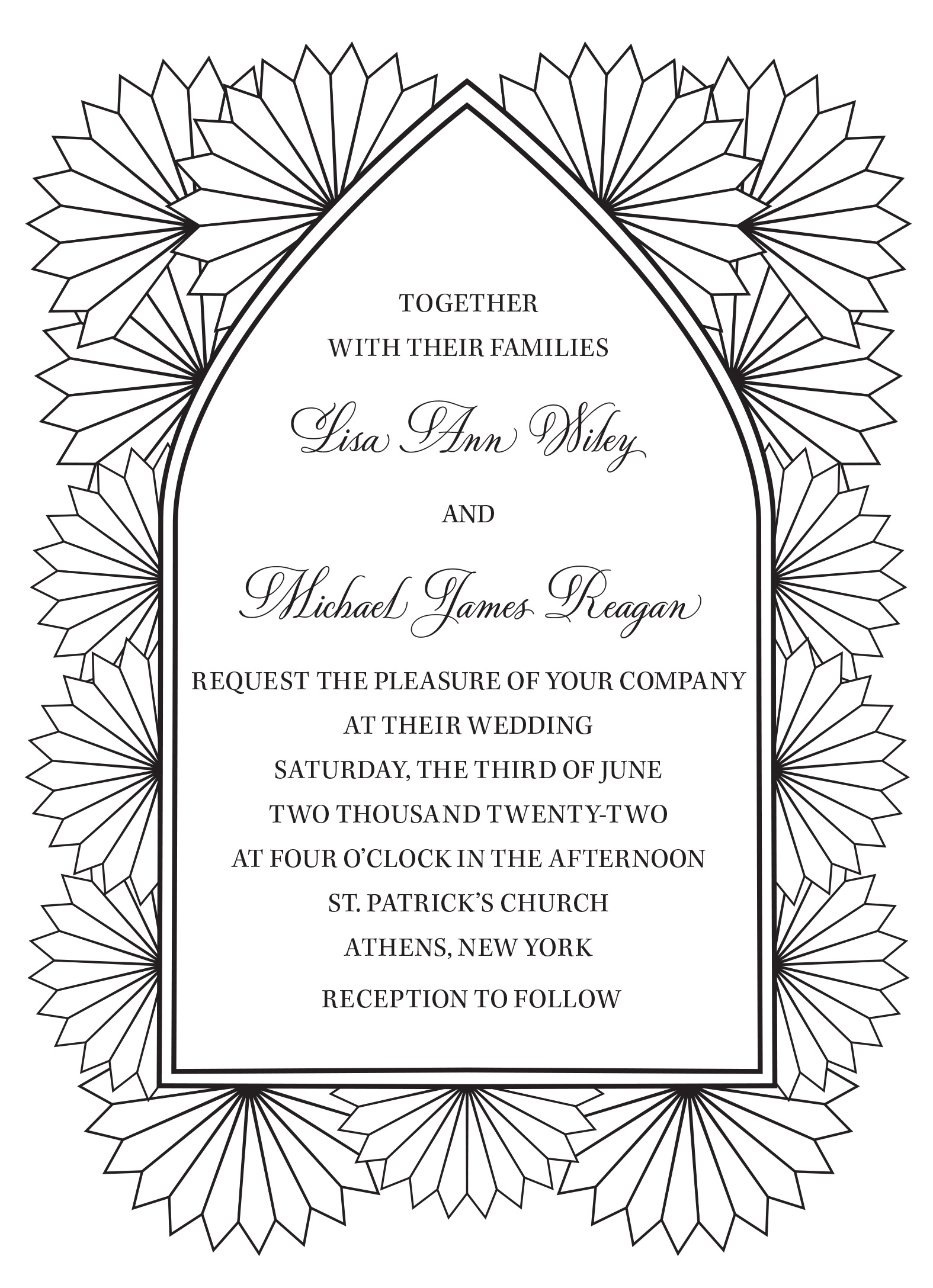 This is a design I created that is black and white line art, and will be used to create a photopolymer plate for printing on a printing press. This wedding stationery is a more formal design with religious overtones.