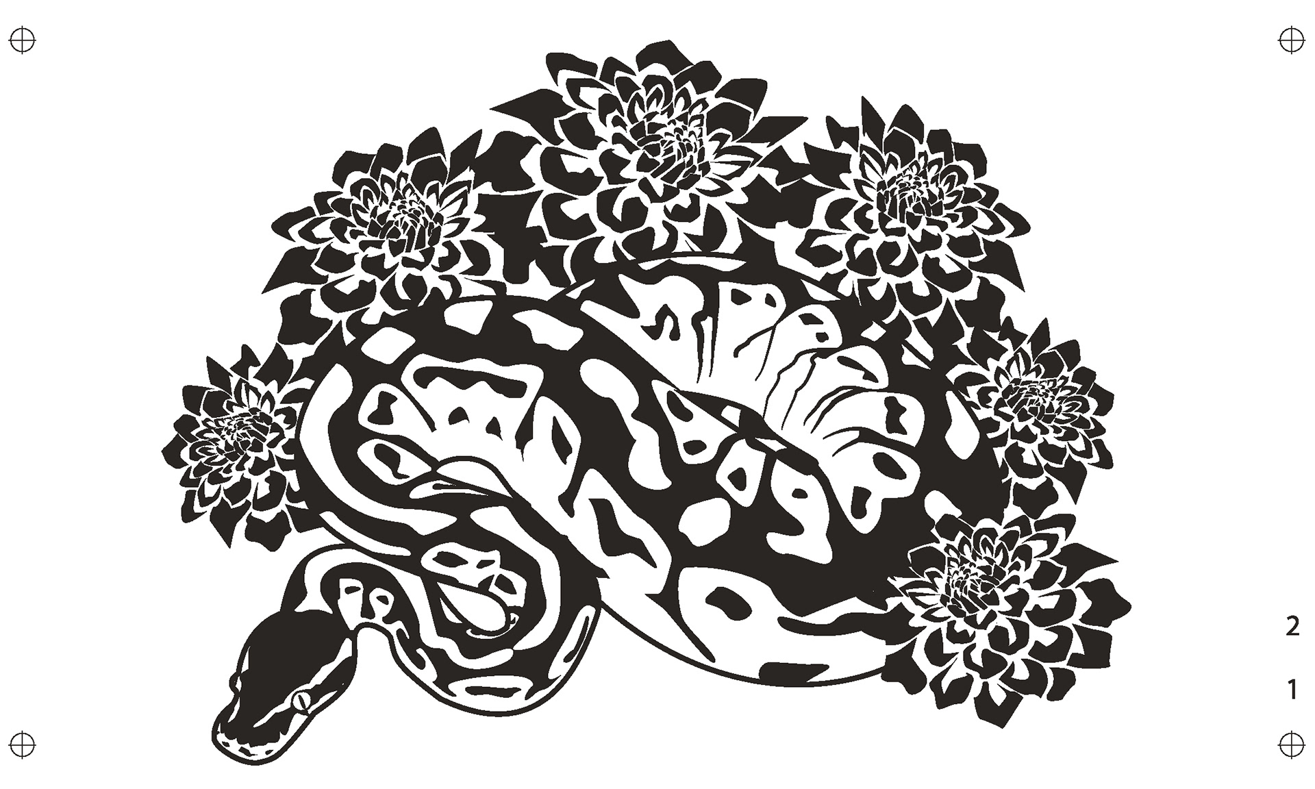 I made each element 100% black. For space sake here, I have both the flowers and the snake in the same image. They layers were sent off as individual pdfs with the same registration marks, as plate 1 and plate 2. The background was much bigger, as it was slightly larger than my 5X7 card, to account for a bleed, so there would not be any white edge on the card.