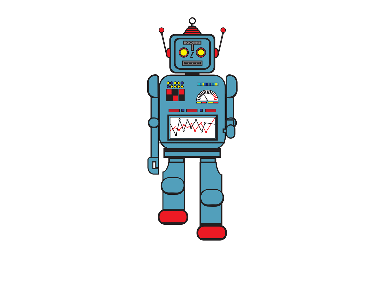 Graphic of vintage style toy robot done in Illustrator with gif created in Photoshop for animation. This is created by layers of posed illustrations stacked as a stop motion in sequence in Photoshop and rendered as an animated gif.