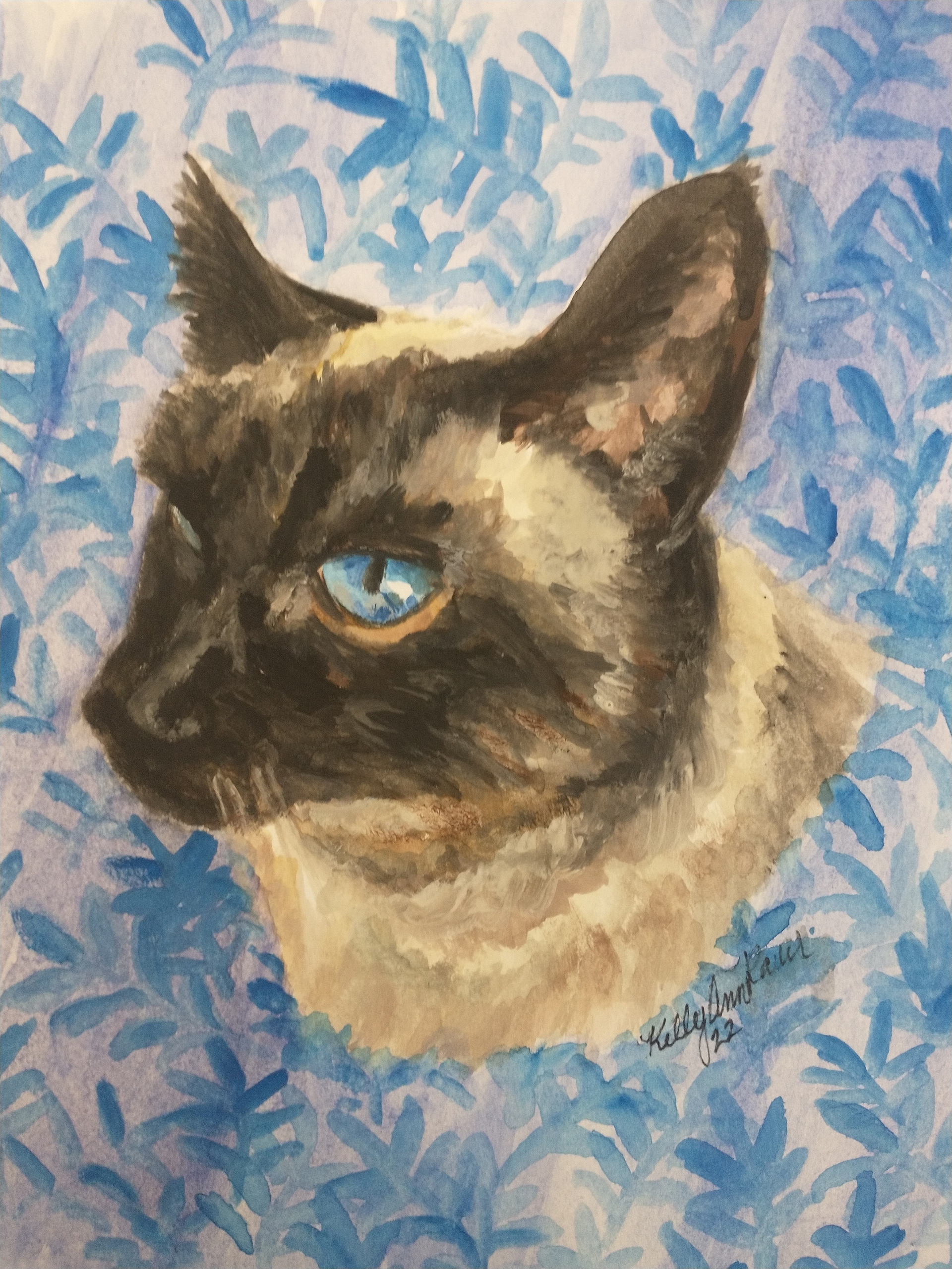 With the exception of some color scales done in an art class in college, I have never tried watercolors. I started out a couple of months ago using watercolor markers and I have finally tried real watercolors. I painted my Siamese cat, Willow.